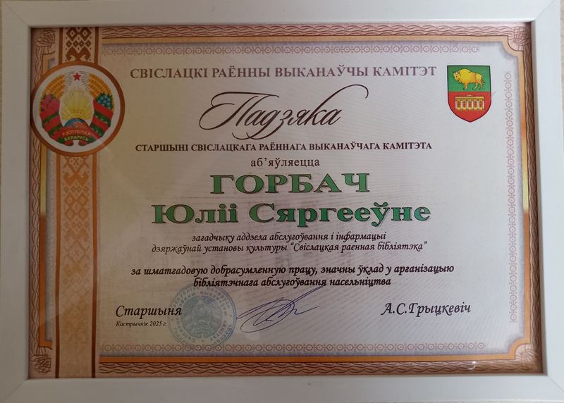 | Благодарность председателя Свислочского районного исполнительного комитета Шваб Натальи Михайловны, заведующего сектором комплектования, обработки и организации единого фонда государственного учреждения культуры «Свислочская районная библиотека», за многолетний добросовестный труд, значительный вклад в сохранение историко-культурного наследия и организацию библиотечного населения. | ![]() |