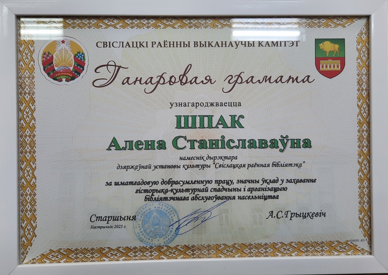 | Почетная грамота Министерства культуры Республики Беларусь Пивоварчик Светланы Ивановны, директора государственного учреждения культуры «Свислочская районная библиотека», за высокий профессионализм и значимый личный вклад в развитие и популяризацию национальной культуры. | ![]() |