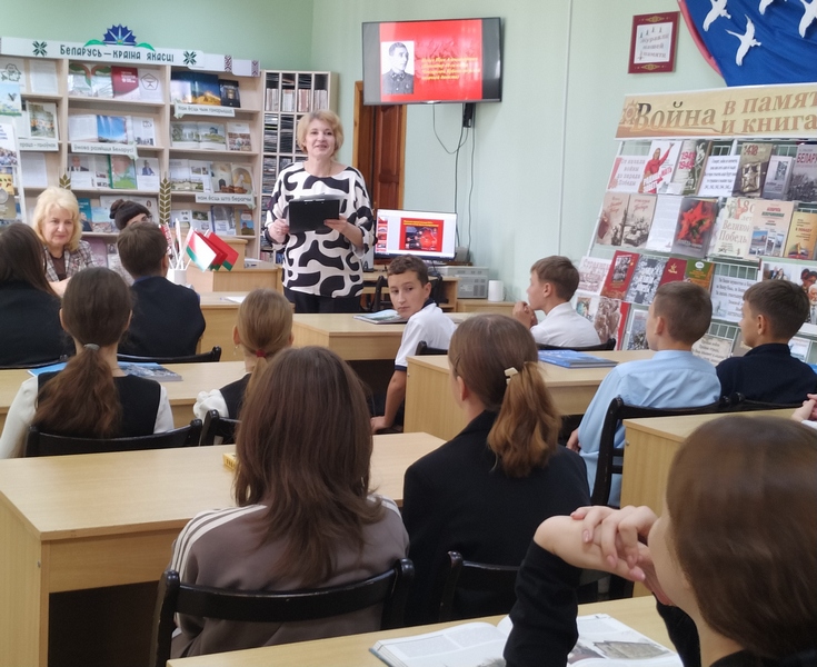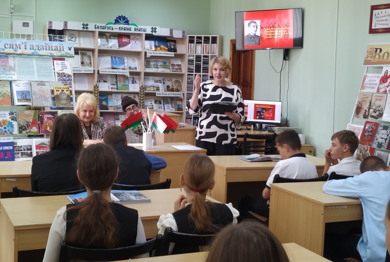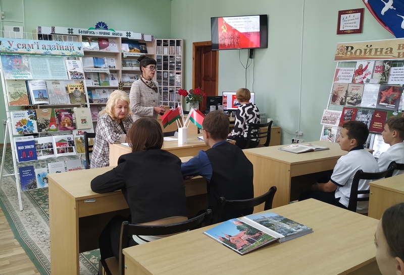 Ребята закрепили полученные знания, ответив на вопросы викторины «День народного единства». В ходе обзора тематической выставки «У сям’і адзінай» школьники с интересом знакомились с книгами, которые приглашают в путешествие по родной стране, знакомят с её историей, символикой, природой и культурой, ещё раз доказывая, в какой красивой и чудесной стране мы живём. В завершение мероприятия вместе выразили мнение «Мы – за единую Беларусь».