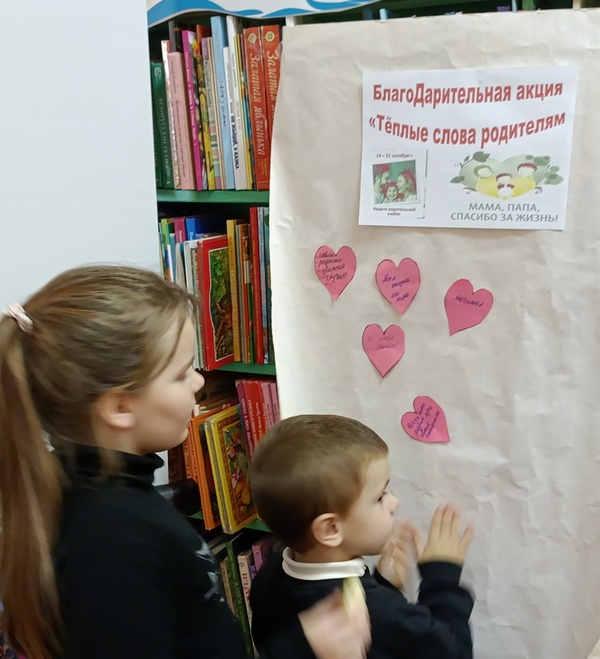В конце встречи, состоялась  благодарительная акция «Тёплые слова родителям». Дети на бумажных сердечках выражали слова благодарности, которые прикрепляли на стенд. Внимание юных читателей привлекла подборка литературы «Мама и папа – главные слова в каждой судьбе».